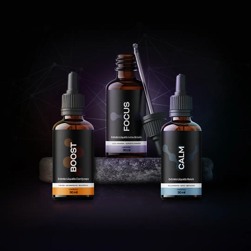 Os três cogumelos funcionais mais estudados do mundo, juntos em um kit. Cada extrato para um momento do dia. Tripla extração do corpo frutífero, dose declarada, zero aditivos.